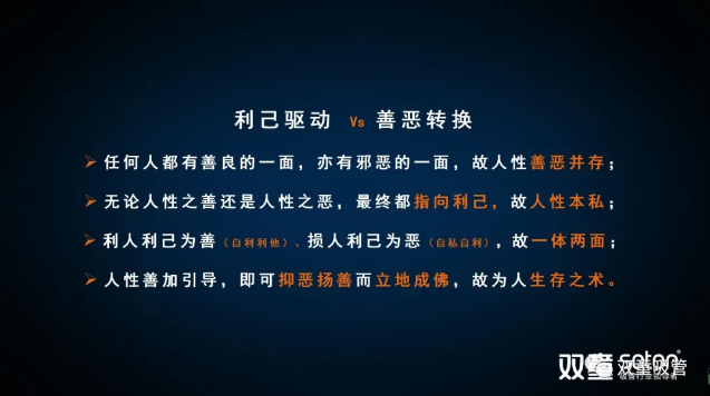 從上圖中大家可以看到,無(wú)論人性之善還是人性之惡,其實(shí)都包含“利己驅動(dòng)”。“利己”是人在長(cháng)期的自然環(huán)境中為了獲得生存不得不獲得更多外部資源的內在驅動(dòng)力,從而導致人總是會(huì )從利己的角度去考慮如何更快、更多的獲得。所以“人性本私”是無(wú)可非議的。