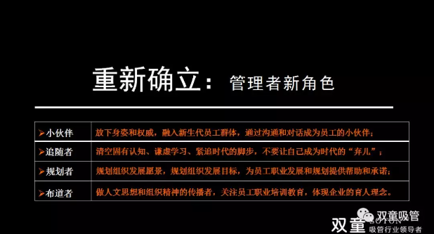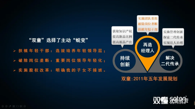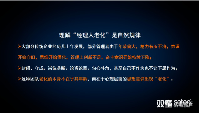 接下來(lái),樓老師通過(guò)“雙童”十年前的案例闡述“雙童”遇到的“經(jīng)理人老化”問(wèn)題: