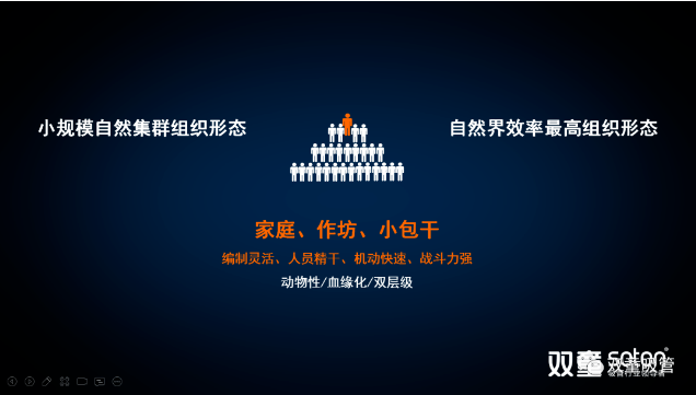 樓老師通過(guò)蟻群、猴群、魚(yú)群等自然界案例和思維邏輯圖,向大家展現了自然界當中普遍存在的自然組織形態(tài)。這種基于動(dòng)物性、血緣化本能而形成的雙層結構的組織形式由于其編制靈活、人員精干、機動(dòng)快速而戰斗力強,是自然界當中存在億萬(wàn)年之久的十分高效的組織形態(tài)。
