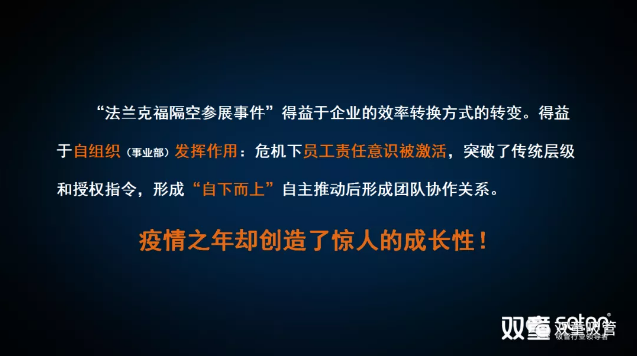 隨后,樓老師通過(guò)“法蘭克福隔空參展事件”,讓大家深刻意識到這種機制催生的巨大活力?!半p童”第三事業(yè)部在2020年2月疫情危機下,自主經(jīng)營(yíng)的員工責任意識被激活,在眾多不利環(huán)境下突破了傳統層級和授權指令,實(shí)現“自下而上”推動(dòng)后形成了緊密的團隊協(xié)作關(guān)系。在眼看參展無(wú)望的絕境下竭盡所能,核心成員通過(guò)創(chuàng )新方式和遠程視頻遙控的方式聘請德國慕尼黑工業(yè)大學(xué)的留學(xué)生全程參展,從而獲得了五年以來(lái)最好的參展效果,在疫情之年取得了驚人的成長(cháng)性。
