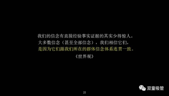 大多數人的誤區之一就是把群體間的共識當成真理。在日常生活中,從眾效應會(huì )使得我們在團隊當中,很難保持獨立判斷;即使團隊信念出錯,我們也幾乎無(wú)法看出團隊在犯錯;即便我們能夠看出團隊信念的錯誤,一個(gè)人的反對意見(jiàn)在洪流中往往也顯得十分微不足道。有時(shí)候正是從眾效應,把企業(yè)、創(chuàng )新者、個(gè)人的思想牢牢地禁錮住了。