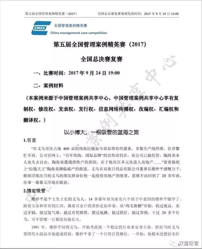 截止到目前,以“雙童”為主題的案例進(jìn)入到國家案例庫的數量就高達5件。其中南京商學(xué)院研究案例《年輕的你到底要什么?——雙童吸管新生代員工培養探索之路》、浙江工業(yè)大學(xué)研究案例《以小博大,一根吸管的藍海之旅》兩件研究案例更是被評為了2016年度百優(yōu)案例!浙江工業(yè)大學(xué)研究案例《以小博大,一根吸管的藍海之旅》還成為了2017年精英賽總決賽的案例!