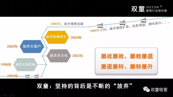 因此,“雙童”在創(chuàng )建最初的10年里,沿著(zhù)以量取勝,不斷擴大規模,以規模換效益的思路,追求大客戶(hù),喜歡大訂單,成為了吸管行業(yè)的龍頭。
