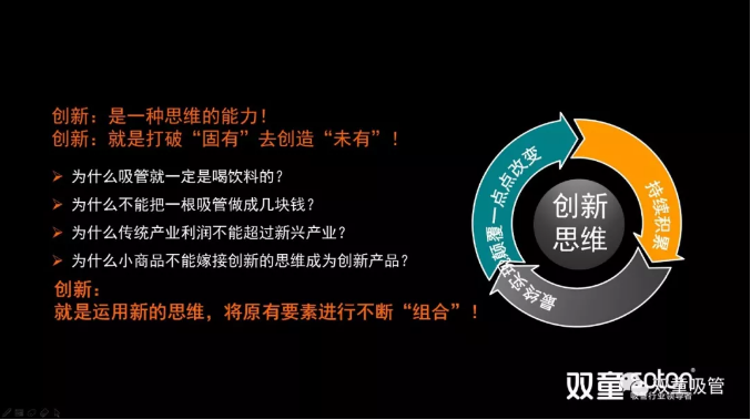 現在,不少人動(dòng)不動(dòng)就喊要創(chuàng )新,但是到底什么是創(chuàng )新?我一直理解創(chuàng )新工作的本質(zhì)在于“思維創(chuàng )新”,就是運用新的思維,將原有要素進(jìn)行不斷“組合”,打破“固有”創(chuàng )造“未有”。只有用創(chuàng )新思維去做產(chǎn)品、做事業(yè),才能改變自己乃至于整個(gè)企業(yè)的命運!