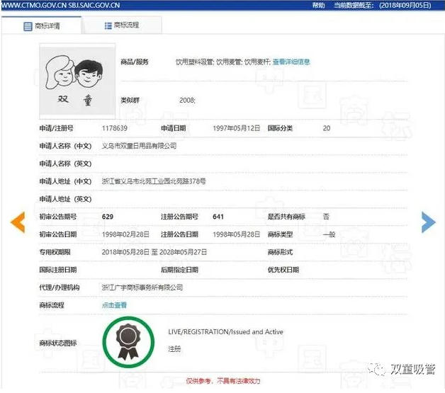 客觀(guān)上講,我們的“雙童”商標在使用和推廣過(guò)程中是得人于先機的,畢竟它已經(jīng)被行業(yè)內所有企業(yè)使用了十多年,后來(lái)我們在注冊臺灣“雙童”商標時(shí)考證了該商標的來(lái)歷,弄清了它的來(lái)龍去脈。該商標先是在70年代后期被臺灣企業(yè)所有,該包裝的產(chǎn)品出口到香港等地,由于香港與廣東有著(zhù)密切的產(chǎn)業(yè)聯(lián)系,到八十年代之后,廣東的吸管生產(chǎn)企業(yè)也相繼使用了該商標圖案作為吸管產(chǎn)品的包裝標記。但在這漫長(cháng)的過(guò)程中竟然沒(méi)有一家企業(yè)想著(zhù)去把她作為商標注冊!由于有了這么一段歷史的淵源,使得我們在后來(lái)的品牌推廣上事半功倍,一下就在吸管行業(yè)內奠定了品牌地位,使我們生產(chǎn)的產(chǎn)品和品牌被廣泛認同。