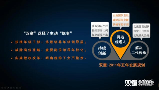 2010年,樓仲平在理解人性活力的“自然遞減”的現象以及經(jīng)理人老化自然規律后,下定決心通過(guò)《雙童五年發(fā)展規劃》的組織變革來(lái)實(shí)施解決“經(jīng)理人老化”問(wèn)題:明確扶植年輕干部,選拔培養優(yōu)秀的年輕領(lǐng)導層,解決二代傳承接班等問(wèn)題。