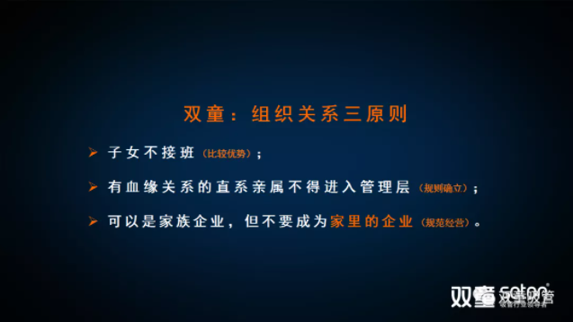 雙童在組織變革后明確形成了“組織關(guān)系三原則”,很多人不理解樓老師在十年前做出的“子女不接班”這樣的傳承安排,樓老師引導大家在傳承問(wèn)題上沒(méi)有絕對的答案,雙童不讓子女接班并非我大公無(wú)私,而是運用經(jīng)濟學(xué)的“比較優(yōu)勢”原理充分酌量后選擇的結果,是綜合考慮了子女的喜好、擅長(cháng)、愿景后而得出的合理安排。當然期間隱含的信號卻發(fā)出了巨大的想象空間。大家想想,在一家經(jīng)營(yíng)了近二十年的傳統制造企業(yè)里面: