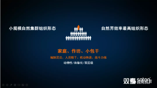 樓老師通過(guò)蟻群、猴群、魚(yú)群等自然界案例和思維邏輯圖,向大家展現了自然界當中普遍存在的自然組織形態(tài)。這種基于動(dòng)物性、血緣化本能而形成的雙層結構的組織形式由于其編制靈活、人員精干、機動(dòng)快速而戰斗力強,是自然界當中存在億萬(wàn)年之久的十分高效的組織形態(tài)。