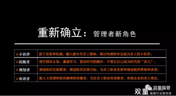 通過(guò)組織變革后形成的機制設立,雙童逐漸給成員釋放出巨大的想象空間,讓優(yōu)秀經(jīng)理人和核心成員不再把目光局限于眼前,繼而逐漸形成三個(gè)“信”:“信號、信任、信心”。形成這種人文環(huán)境后,人性中隱藏著(zhù)的巨大活力得以釋放!年輕人得到極大鼓勵,特別是90后新生代核心員工逐漸進(jìn)入管理崗位并成為雙童核心管理層后,就有了更為長(cháng)期的協(xié)同和追求,年輕團隊的活力、潛力和實(shí)力開(kāi)始逐步展現。