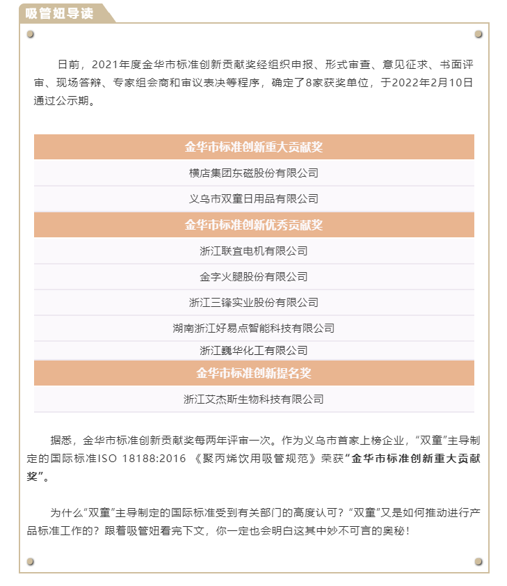 義烏市雙童日用品有限公司給出的答案不是低價(jià)競爭,也不是規模效應,而是掌握制定標準的話(huà)語(yǔ)權。一路走來(lái),“雙童”先后投入上千萬(wàn)元巨資,主導起草了吸管產(chǎn)業(yè)的團體標準、行業(yè)標準、國家標準和ISO國際標準。