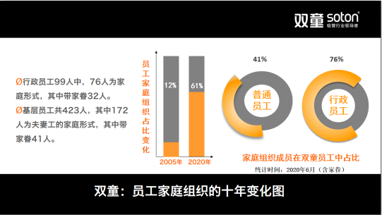 雙童早期團隊的很多成員,都是在公司內部找到自己的人生伴侶,生兒育女、組成一個(gè)個(gè)小家庭,逐漸形成雙童特色的“家文化”。目前,以家庭形式存在的雙童員工占員工總數的一半多,在他們當中,有夫妻工、有帶小孩的、還有老人帶小孩的家庭,長(cháng)期生活在公司的家屬就有一百多人,其中在本地就學(xué)的員工子女有50多人。雙童再次重申:我們鼓勵在公司就業(yè)的單身員工通過(guò)認識彼此,找到終生伴侶,在公司組建家庭、撫養子女,鼓勵有條件的員工帶父母一起在公司生活。