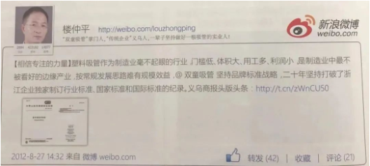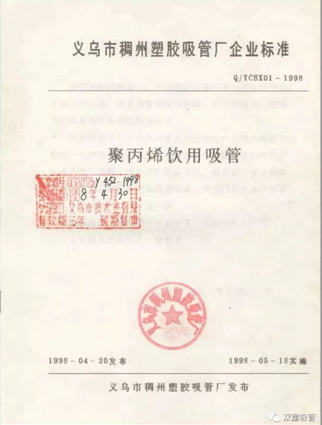 說(shuō)干就干的樓仲平回去后就查閱各種資料,向義烏市技術(shù)監督局借來(lái)了當時(shí)義烏水泥廠(chǎng)的水泥產(chǎn)品標準借鑒。1998年4月,由雙童前身的義烏市稠州塑膠吸管廠(chǎng)起草的《聚丙烯飲用吸管》正式獲準發(fā)布,成為當時(shí)吸管行業(yè)最早發(fā)布的產(chǎn)品標準。