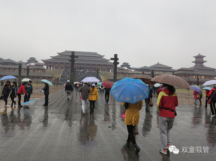 酒足飯飽,雖然天下著(zhù)蒙蒙細雨,但是大家的勁頭依然很足!因為下午的游玩目的地,就是張藝謀導演的《英雄》電影的拍攝地——秦皇宮!剛下車(chē),導游就告訴我們,秦皇宮將馬上開(kāi)演電影《英雄》中的《英雄比劍》真人演繹片段!愛(ài)熱鬧的雙童人你追我趕,不一會(huì )就把整個(gè)演出場(chǎng)地都擠的滿(mǎn)滿(mǎn)的!