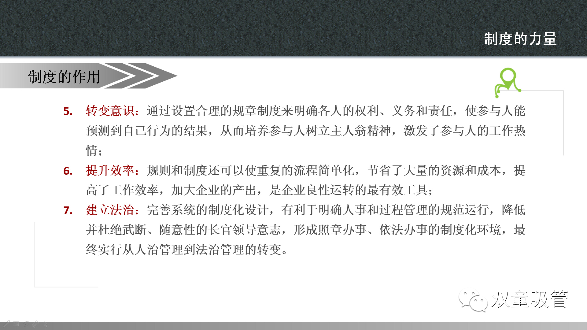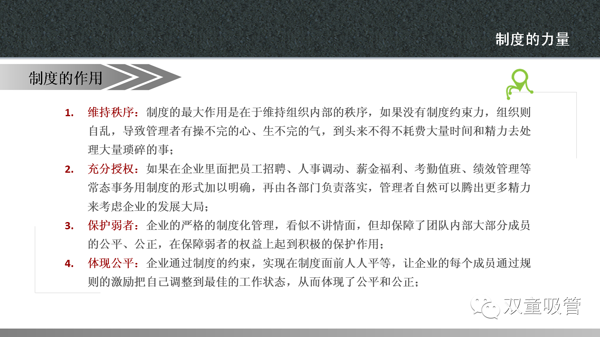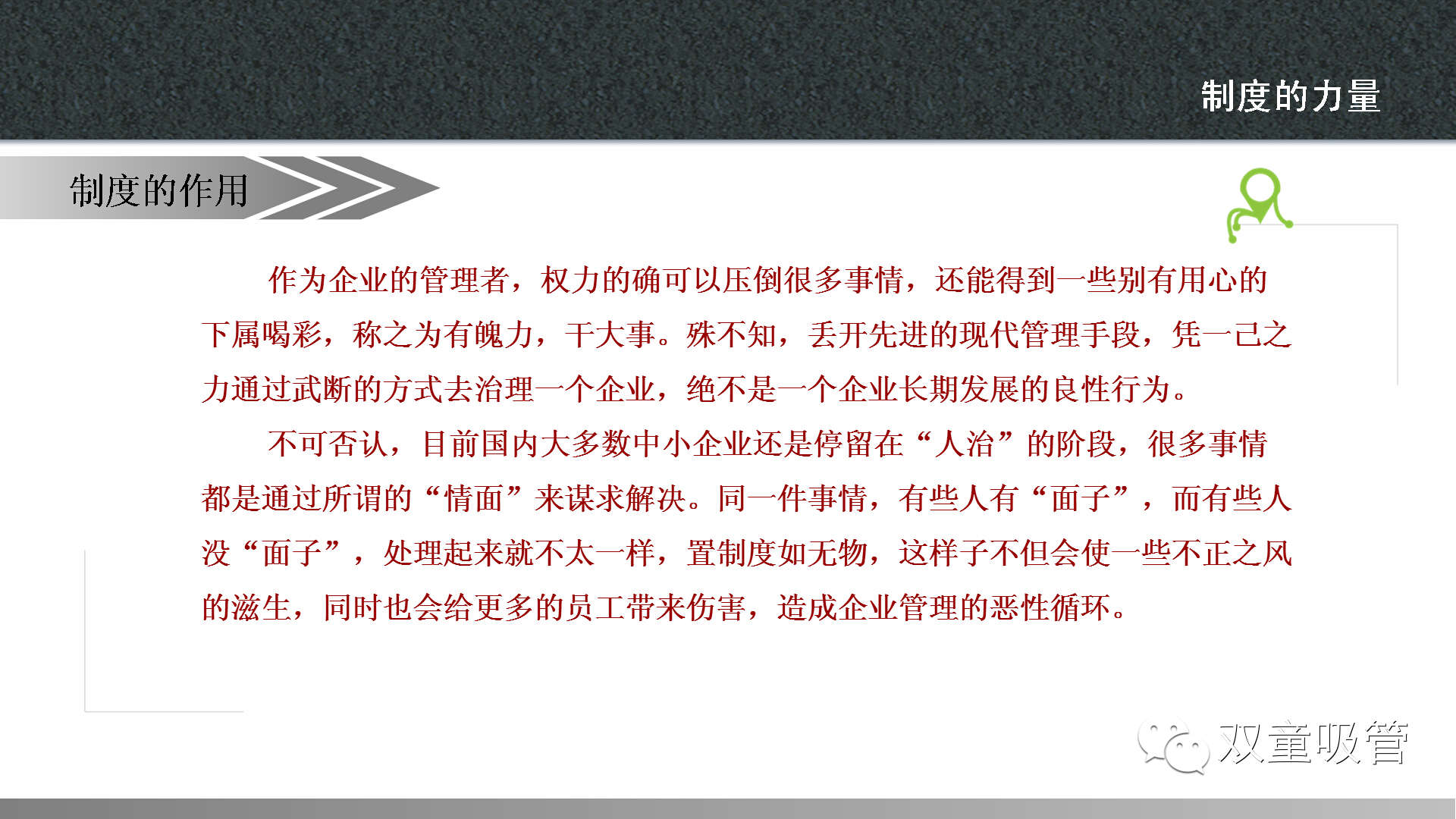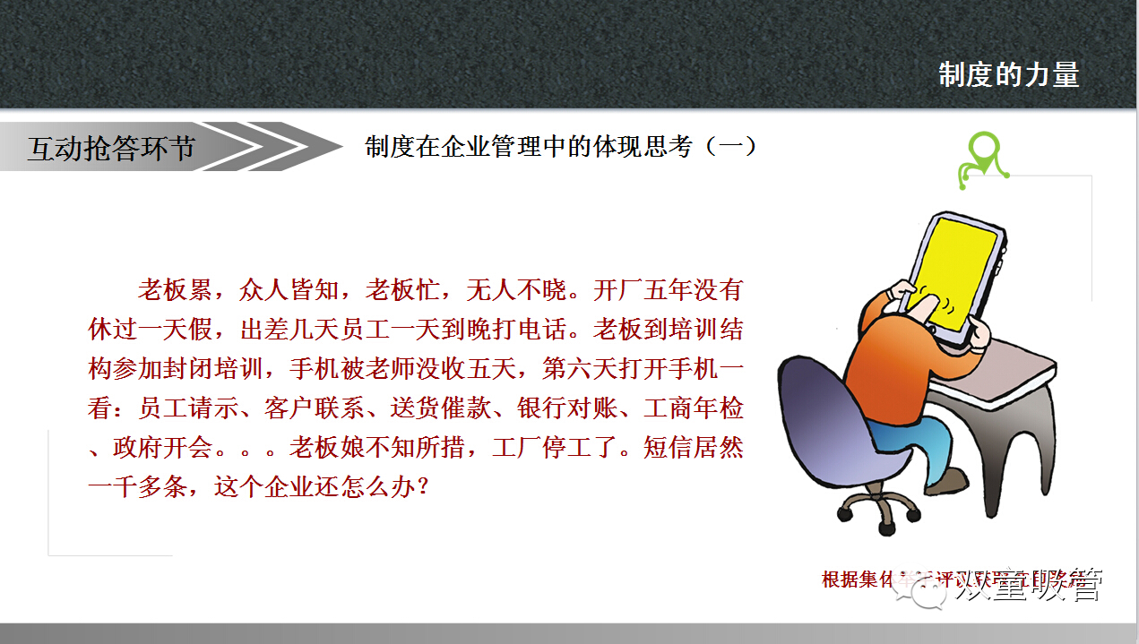 當然啦,這樣的案例,當家人準備了許多,讓大家在快樂(lè )中學(xué)習到了制度的魅力。以前吸管妞總是有一種誤解,覺(jué)得制度就是上級用來(lái)管理下級的一種方式。通過(guò)昨天的課程終于讓妞明白了,原來(lái)制度不僅僅是有利于上級管理,更有利于雙方的權利得到保障,讓公司的流程化管理更加準確高效!下面,吸管妞就把干貨放上來(lái),大家可要好好看哦!