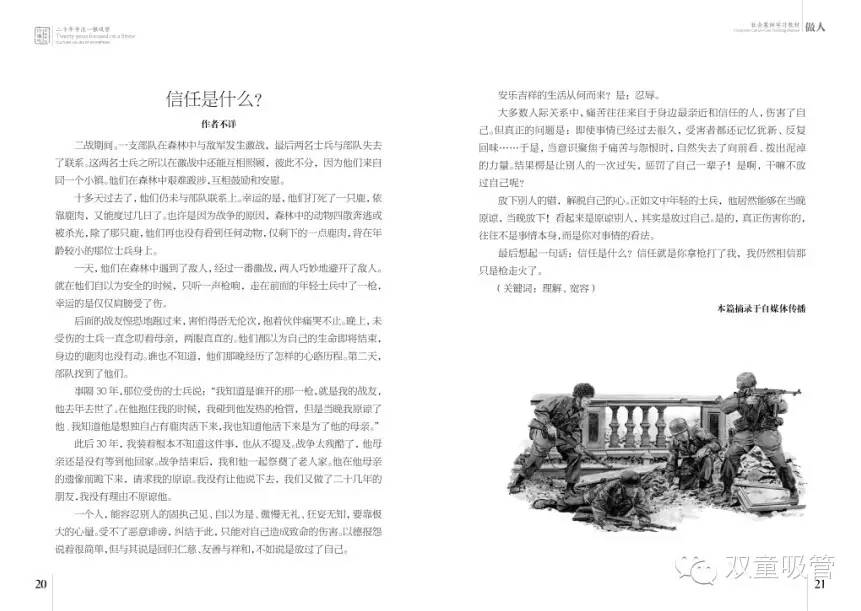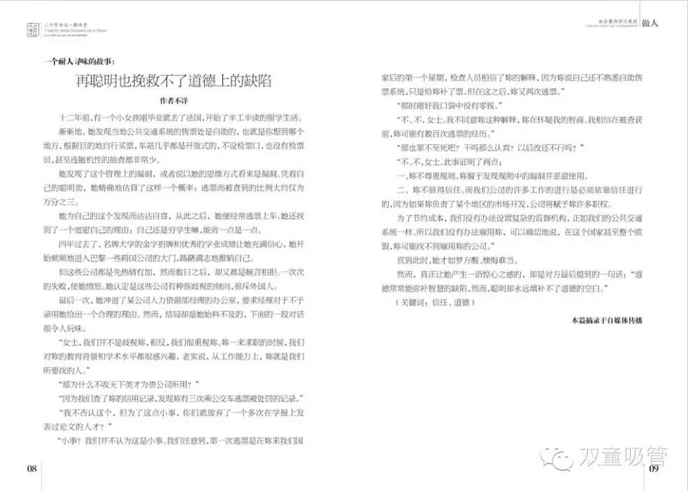 《社會(huì )案例學(xué)習教材》里包括了做人、做事、經(jīng)營(yíng)文化、管理文化等各個(gè)主題的經(jīng)典好文,實(shí)際上也是按照雙童的企業(yè)文化要素進(jìn)行分類(lèi)收錄,其中一大部分都是從吸管妞平時(shí)發(fā)給大家的微信文章里收集到的哦!