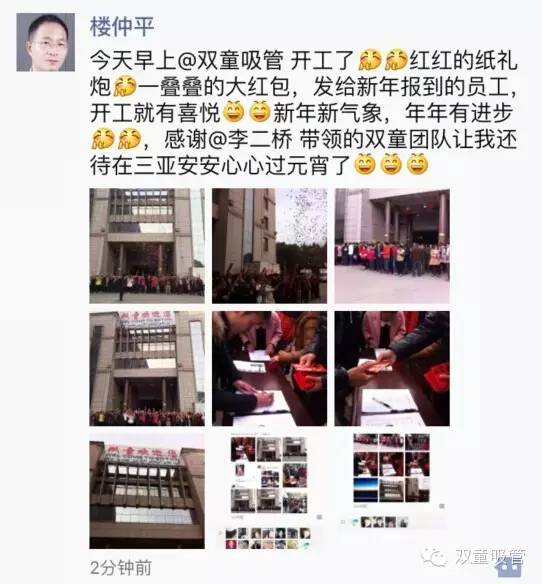 今年,每位回廠(chǎng)的員工都會(huì )在開(kāi)工儀式上收到一個(gè)大大的開(kāi)工紅包哦!這也給開(kāi)工儀式帶來(lái)了更多的歡樂(lè )和喜悅!咦?奇怪了,我們的當家人樓總咋不見(jiàn)蹤影呢?看看朋友圈,原來(lái)他還在三亞沒(méi)回來(lái)呢!而不管是過(guò)年前的一系列收尾安排,還是今天這場(chǎng)開(kāi)工儀式,全都是由二當家李二橋帶領(lǐng)團隊協(xié)作完成的呢!這些原本需要老板親自策劃動(dòng)腦的事情,現在已經(jīng)慢慢全部交由我們的雙童團隊合力完成,可以看出,我們的團隊也在慢慢的成長(cháng)成熟,可以不依賴(lài)當家人獨當一面啦!