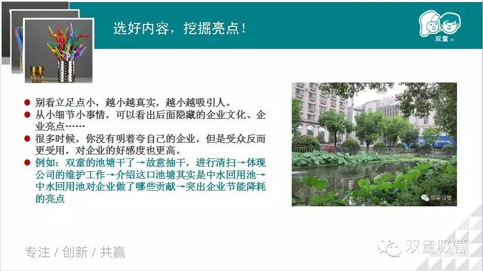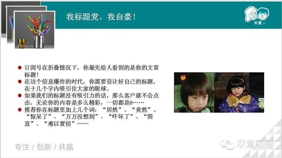 現如今微信發(fā)展如火如荼,用微信公眾平臺作為營(yíng)銷(xiāo)和品牌推廣工具已是眾大企業(yè)和商家的不二之選。那么,究竟如何才能事半功倍地運營(yíng)微信公眾平臺呢?不吹牛的說(shuō),吸管妞經(jīng)常能聽(tīng)到一些朋友對“雙童吸管”微信公眾平臺的夸贊,說(shuō)這是義烏企業(yè)界運營(yíng)得最好的微信公眾號。那么這次吸管妞就結合了自己在運營(yíng)“雙童吸管”微信公眾號時(shí)所積累的一些經(jīng)驗,把它們做成PPT分享給大家,共同分享,共同進(jìn)步!