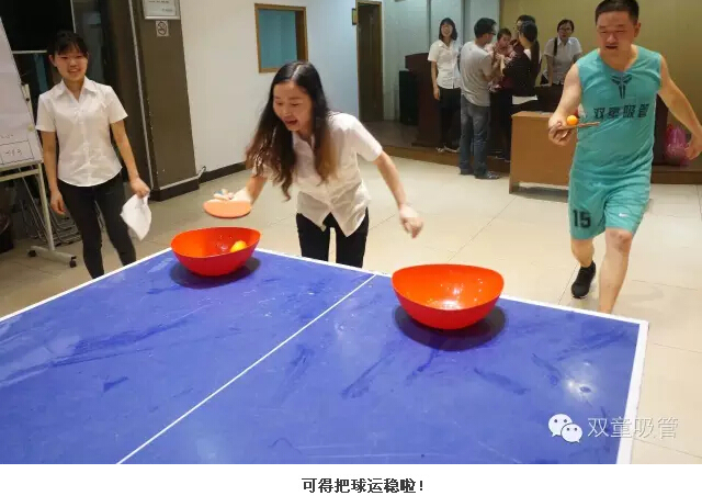 別急!先來(lái)玩玩小游戲。瞧!捏鼻子 轉大象、定點(diǎn)投乒乓球等游戲層出不窮。大伙運球之前必須先轉上5圈,哎呀!還沒(méi)拿起球拍運球,就暈在乒乓球桌上了!逗得在場(chǎng)觀(guān)眾們都捧腹大笑!