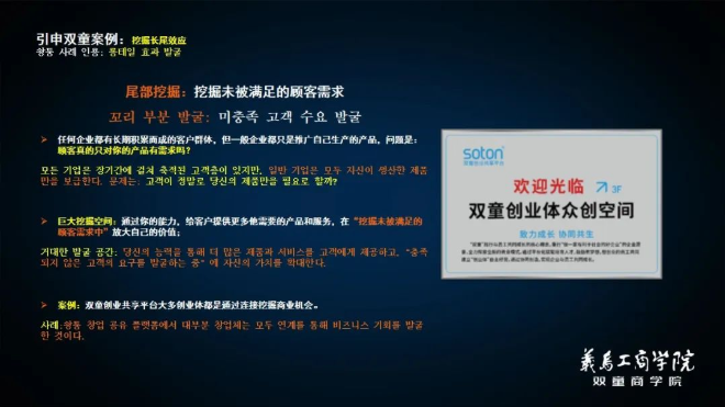 樓仲平課程分享ppt節選 從逆向思維、長(cháng)尾效應到破界創(chuàng )新,在樓仲平引導下,北大學(xué)子被“與其更好、不如不同”的錯位競爭理念深深的吸引。而韓國的創(chuàng )業(yè)青年們也從中得到啟發(fā),圍繞自身優(yōu)勢,開(kāi)始不斷思考和尋找未被發(fā)掘的市場(chǎng)需求。