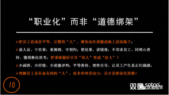 在“理性”思維的持續引導下,“雙童”在文化中倡導把員工看成是平等、完整的“人”,而非站在道德高地上居高臨下,處處體現尊重、公平和雙贏(yíng)。我們理解員工是有血有肉的“人”,而非單純的勞動(dòng)力,對待員工少“畫(huà)餅”,少抒情,懂得換位思考,不去“道德綁架”員工,才能讓員工真正產(chǎn)生歸屬感。