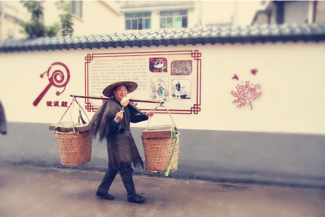 挑“貨郎擔”用的扁擔和一般的扁擔是不一樣的,杉木扁擔很軟,挑的過(guò)程當中會(huì )很有節奏的搖起來(lái)。