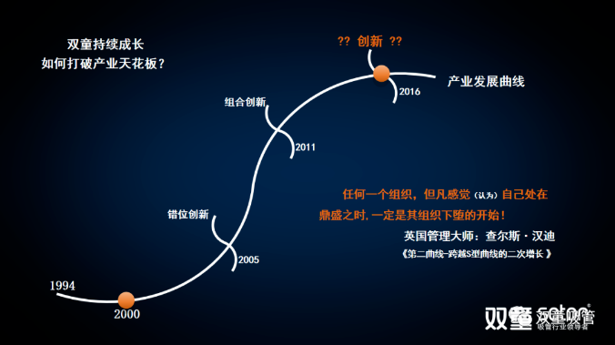 “雙童”從2011年底啟動(dòng)的“再造經(jīng)理人”組織變革,于2015年底全面完成。重新組建的“雙童”行政團隊在當時(shí)平均年齡不到30歲,核心團隊的大部分都是90后,新生代員工已成為“雙童”的核心管理骨干。借由2011年的五年發(fā)展規劃,“雙童”實(shí)現了現代化企業(yè)組織變革,解決了作為傳統企業(yè)的“老、大、難”問(wèn)題。