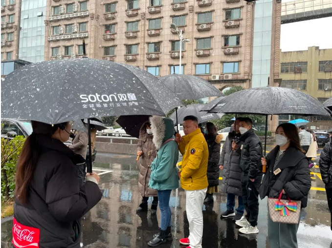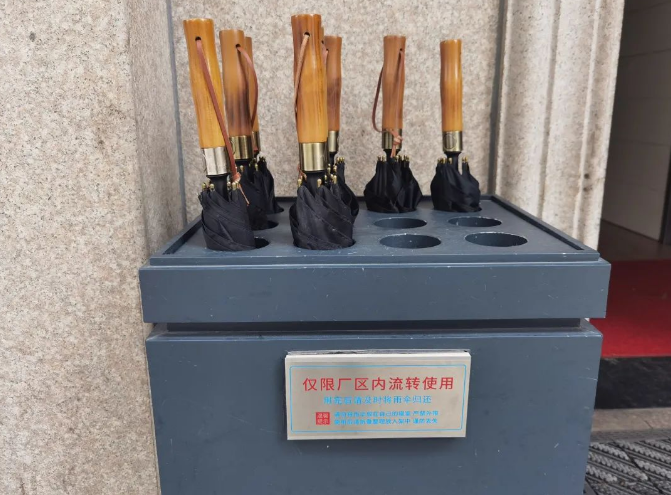 2020年4月,“雙童”董事長(cháng)樓仲平注意到,下雨天總會(huì )有不少員工,因為忘記帶傘而被困在廠(chǎng)房和食堂里,無(wú)法出行,這樣不僅耽誤行程、影響工作進(jìn)度,冒雨而行還可能對健康不利。為此,樓仲平讓后勤部門(mén)定制了第一批流動(dòng)雨傘,在一、二期廠(chǎng)房和宿舍樓下投入使用。