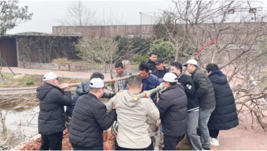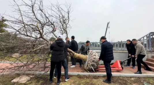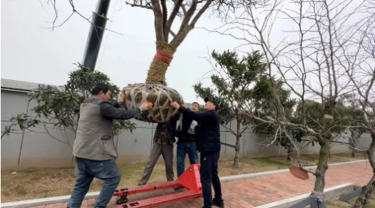 大家一起將大樹(shù)從搬運車(chē)上卸下來(lái)