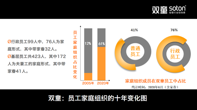 所以啊,“雙童”早期團隊里的很多成員都是內部消化的,大家在公司里找到自己的人生伴侶,并生兒育女、組成一個(gè)個(gè)小家庭,最后匯聚成“雙童”這個(gè)大家庭。久而久之的“雙童”家文化就貫徹在每一位員工心中,大家都把公司當成了“第二個(gè)家”。