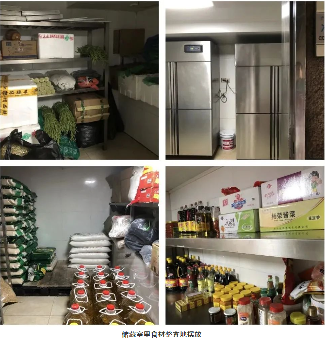 其中采購入庫的魚(yú)、肉等易腐爛變質(zhì)的葷菜必須分區妥善保存在冰箱中,新鮮蔬菜與米、面等主食原料分開(kāi)存放;除了常規的食材分開(kāi)存放外,食用油、大米、面粉、面條、調味料等食材消耗品,進(jìn)行分類(lèi)、分架、隔墻、離地存放。