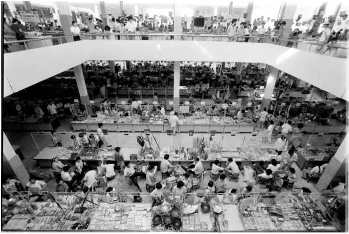 這個(gè)大膽的設想在篁園市場(chǎng)得以落地。1992年2月,篁園市場(chǎng)一期開(kāi)業(yè),內設7100個(gè)攤位,主要經(jīng)營(yíng)日用百貨、針棉、線(xiàn)帶、鞋類(lèi)、紐扣、眼鏡等大類(lèi)商品。樓仲平拿出家底2000元,在這租攤位,同朱燕俊一樣,抽到百貨攤位,他們成為了“同行”,甚至是隔壁攤位。
