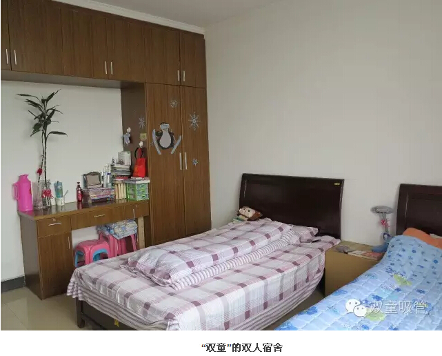 而當大家來(lái)到最期待的員工寢室時(shí),同學(xué)們的反應也是在吸管妞的意料之中。每個(gè)房間都配有干凈整潔的洗手間、寬敞明亮的洗衣陽(yáng)臺,并配有各種家具,每個(gè)房間安裝有空調,24小時(shí)供應熱水洗澡和純凈飲用系統。驚羨之聲隨處可聽(tīng)。當吸管妞和同學(xué)們說(shuō),我們寢室的衛生工作都是由清潔阿姨打掃的,連垃圾桶都不用倒!他們紛紛自薦:我要來(lái)“雙童”實(shí)習!
