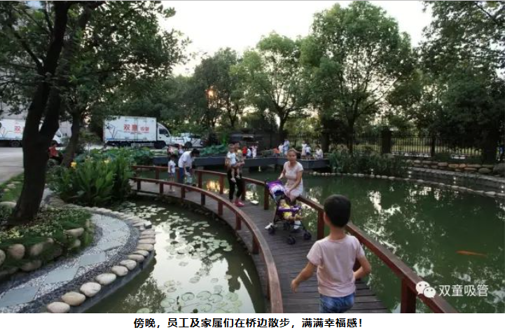 在一天忙碌的工作結束后,“雙童”人喜歡漫步在九曲橋邊,家屬們也常常帶著(zhù)孩子來(lái)這里乘涼聊天,湖邊河卵石的小路上到處坐滿(mǎn)了人,這里的好風(fēng)光給大家帶來(lái)了滿(mǎn)滿(mǎn)的幸福感!