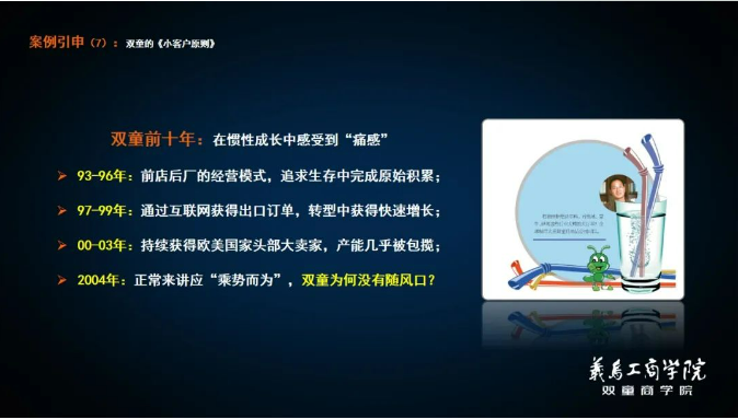 從1997年開(kāi)始,“雙童”已經(jīng)充分利用互聯(lián)網(wǎng)技術(shù),外貿出口比例一度達到90%以上。但“雙童”意識到,所謂的“大客戶(hù)”,不僅利潤低下,還嚴重擠壓了企業(yè)優(yōu)質(zhì)中小客戶(hù)的訂單,對企業(yè)未來(lái)發(fā)展是很不利的。從2004年開(kāi)始,“雙童”開(kāi)始慢慢放棄“大客戶(hù)”,繞開(kāi)習慣依賴(lài)的經(jīng)驗主義,轉而推行“小客戶(hù)原則”。通過(guò)戰略轉變,“雙童”把原先每100根吸管僅8分錢(qián)的利潤,提升到了有20%以上利潤率的提價(jià)空間,牢牢掌握了“雙童經(jīng)營(yíng)的主動(dòng)權。