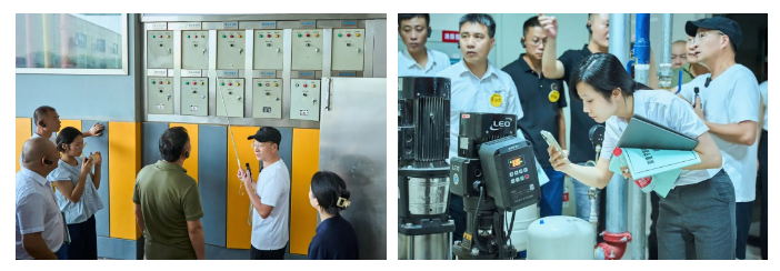 樓總在和學(xué)員們介紹二期廠(chǎng)房水泵的工作情況