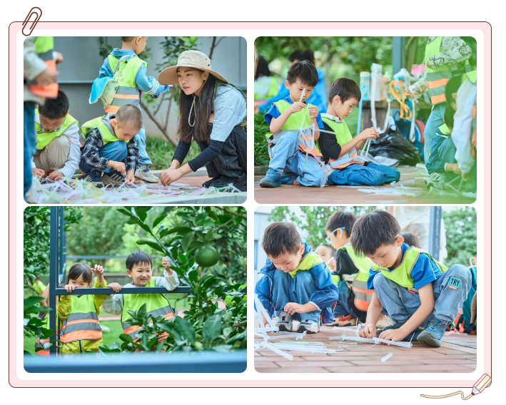 當然,幼兒園的老師們也精心準備了益智游戲——編制吸管網(wǎng)。也就是把吸管作為“網(wǎng)線(xiàn)”,一點(diǎn)一點(diǎn)拼接為一張很大的網(wǎng)???,小朋友們做的多么認真。
