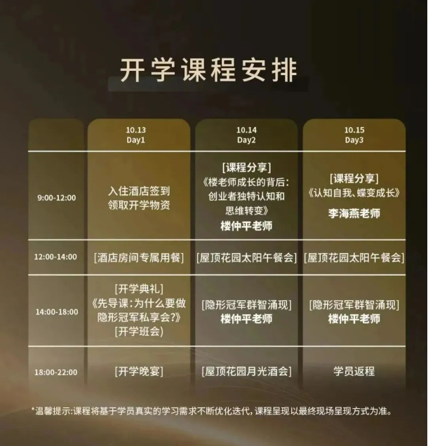 樓仲平·隱形冠軍私享會(huì )第一模塊課程時(shí)間為三天兩夜,樓仲平老師將分享其成長(cháng)背后的底層邏輯《創(chuàng )業(yè)者獨特認知和思維轉變》,李海燕老師則帶來(lái)《認知自我、蝶變成長(cháng)》課程分享。
