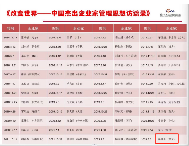 同時(shí)期,中國規模最大的財經(jīng)媒體頻道《第一財經(jīng)》,在2023年9月22日晚八點(diǎn)播出著(zhù)名主持人秦朔老師與樓仲平老師的訪(fǎng)談專(zhuān)題片《樓仲平:順時(shí)而變》:通過(guò)自學(xué)成才后,通過(guò)知識的運用推動(dòng)雙童30年快速發(fā)展,用“一根吸管”的實(shí)踐解析中國改革開(kāi)放后中小企業(yè)在有限條件下如何突破并穿越一個(gè)個(gè)越來(lái)越難的經(jīng)濟周期。在企業(yè)獲得長(cháng)足發(fā)展和個(gè)人財富自由后,樓仲平老師毅然轉型創(chuàng )業(yè)教育,創(chuàng )辦雙童商學(xué)院,全力投身并助力中小企業(yè)在經(jīng)營(yíng)和管理上的瓶頸突破。