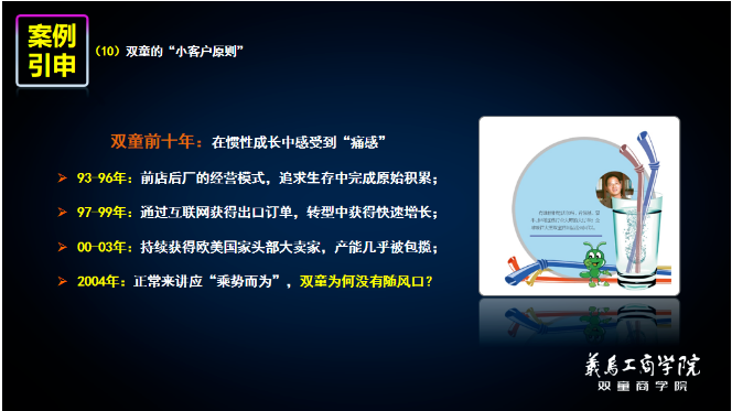在2004年之前,“雙童”充分利用互聯(lián)網(wǎng)技術(shù),發(fā)展可謂一路高歌猛進(jìn),已經(jīng)挖掘到五六家國際大買(mǎi)家的采購訂單,按照正常成長(cháng)的路徑依賴(lài)原則講,“雙童”應該乘勢抱緊“大客戶(hù)”,迅速拓展自己的商業(yè)版圖,但是沒(méi)有?!半p童”意識到,所謂“大客戶(hù)”,不僅利潤低下,還嚴重擠壓了企業(yè)優(yōu)質(zhì)中小客戶(hù)的訂單,對企業(yè)未來(lái)發(fā)展不利。