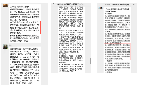 研學(xué)班學(xué)員在社長(cháng)講解下,詳細參觀(guān)了整個(gè)酒造場(chǎng)的生產(chǎn)過(guò)程。跟著(zhù)社長(cháng)“逛”了一圈兒,大家早就被酒香“陶醉了”,已經(jīng)忍不住要體驗一下了~從生產(chǎn)車(chē)間出來(lái),大家又被酒造場(chǎng)戶(hù)外的綠色深深吸引,整個(gè)酒造場(chǎng)宛若建在叢林深處,清新、宜人,精妙的綠色環(huán)保型廠(chǎng)區讓學(xué)員們紛紛化身“好奇寶寶”,迫不及待地邀請社長(cháng)答疑~為了能夠讓大家勞逸結合,每次學(xué)習都能以最佳的學(xué)習狀態(tài),在整個(gè)研學(xué)路線(xiàn)中,也穿插了不同的景點(diǎn),感受日式商業(yè)中心,東京最古老的淺草寺,走進(jìn)日本知名TOP級頂尖高校東京大學(xué)……除了走進(jìn)景區,研學(xué)班還走進(jìn)東京最高學(xué)府——東京大學(xué)課堂,理論+實(shí)踐,企業(yè)才能走得更長(cháng)遠,實(shí)地走訪(fǎng)了多加企業(yè)之后,研學(xué)班學(xué)員在行程最后一站安排到了東京大學(xué)!由東京大學(xué)教授親自為學(xué)員們授課,讓大家通過(guò)另一個(gè)維度的學(xué)習賦能企業(yè)成長(cháng)!東京大學(xué)教授就《日本的商業(yè)零售及其特點(diǎn)》,為來(lái)訪(fǎng)者進(jìn)行授課~大家在本期日本游學(xué)最后一站點(diǎn)-東京大學(xué)合影通過(guò)本次日本企業(yè)游學(xué)之旅,很多學(xué)員都深受啟發(fā),加之樓仲平和祖林老師幫助學(xué)員們理清思路。在貫穿研學(xué)全程的巴士課堂上大家暢所欲言,分享所見(jiàn)所得所想。無(wú)論是從巴士課堂上的分享發(fā)言、還是從形成文字感悟來(lái)看,都能看出來(lái)大家收獲滿(mǎn)滿(mǎn)!結束當天的企業(yè)參訪(fǎng)后,研學(xué)班所有學(xué)員都能做到及時(shí)復盤(pán)!行在路上,學(xué)在心里!