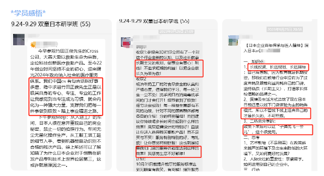兩期日本企業(yè)游學(xué)之旅,很多學(xué)員都深受啟發(fā),在貫穿研學(xué)全程的巴士課堂上大家暢所欲言,分享所見(jiàn)所得所想。無(wú)論是從巴士課堂上的分享發(fā)言、還是從形成文字感悟來(lái)看,都能看出來(lái)大家收獲滿(mǎn)滿(mǎn)!