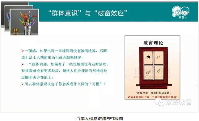 一個(gè)組織內部,如果有了一些垃圾而沒(méi)有及時(shí)清理,緊接著(zhù)就會(huì )有更多垃圾,最終人們會(huì )理所當然地將垃圾順手丟棄在地上。所以群體意識決定了你會(huì )養成什么樣的“習慣”,而你的習慣也會(huì )影響著(zhù)整個(gè)集體。