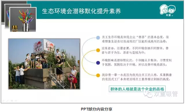 親愛(ài)的“雙童”粉絲們,你們還記得上堂課當家人樓總提到其實(shí)九樓的空中菜園、廠(chǎng)區的綠化,甚至于公司墻上的標語(yǔ)文化都和產(chǎn)品質(zhì)量有著(zhù)很大的關(guān)系嗎?今天妞就圖文并茂展示給大家看看吧!