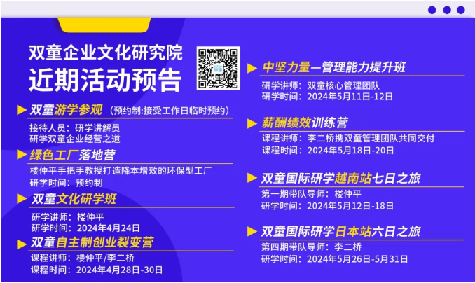沒(méi)趕上本次《冠軍之旅》的朋友也別擔心,2024年5月26日,雙童總經(jīng)理李二橋也將帶領(lǐng)30多位企業(yè)家朋友一起,走進(jìn)世界500強企業(yè)、百年長(cháng)壽企業(yè)、專(zhuān)精特新企業(yè),深入企業(yè)工廠(chǎng)內部,從“細枝末節”處考察,全方面學(xué)習優(yōu)秀經(jīng)營(yíng)理念,助力企業(yè)成長(cháng)!