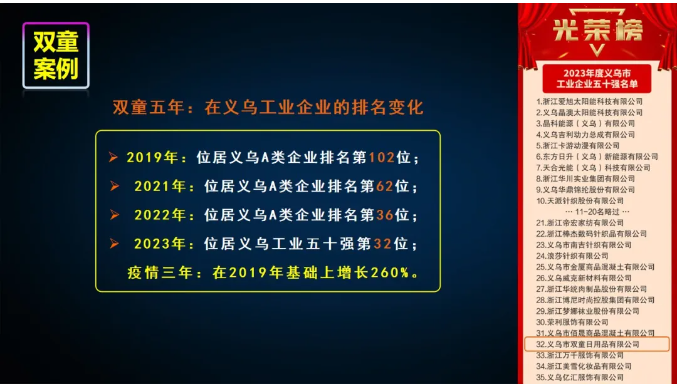 2023年,平臺整體增長(cháng)35.24%;平臺稅收增長(cháng)23.30%,成功登榜“納稅千萬(wàn)元以上工業(yè)企業(yè)”和“義烏市工業(yè)企業(yè)五十強”!