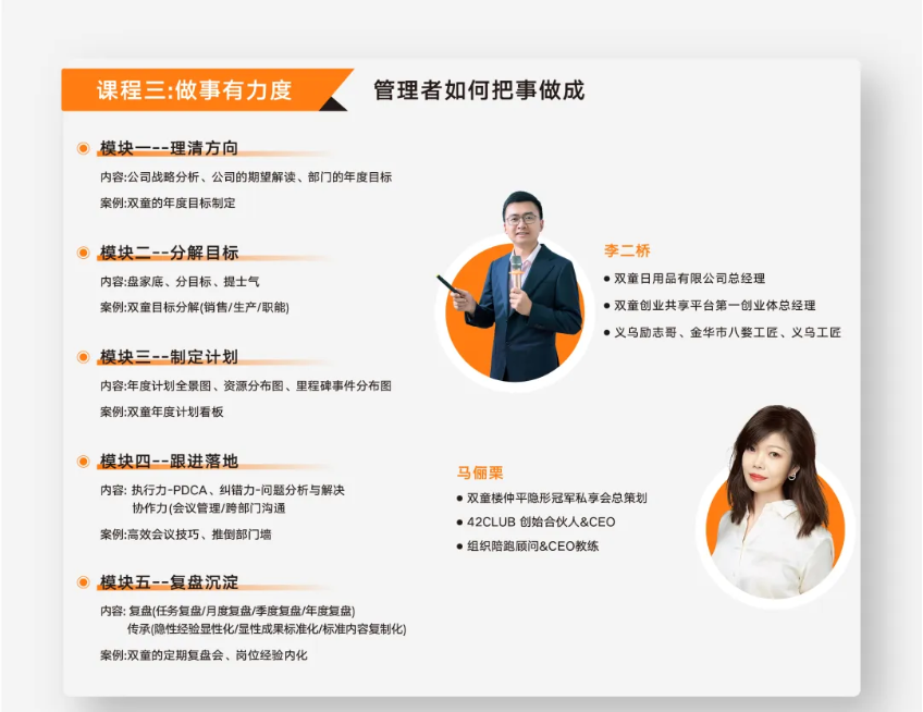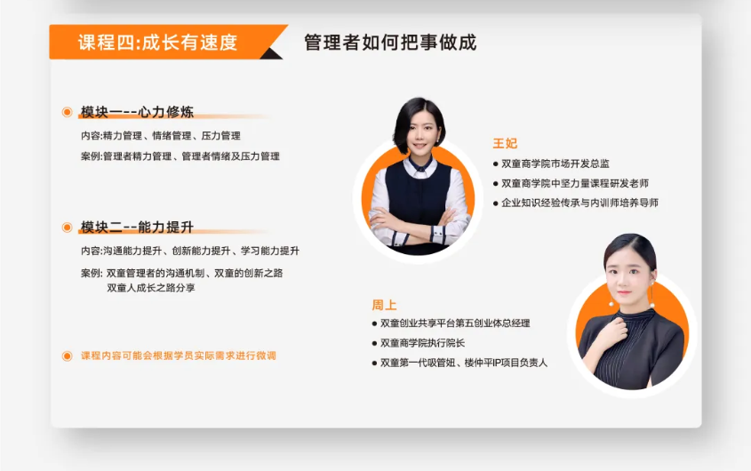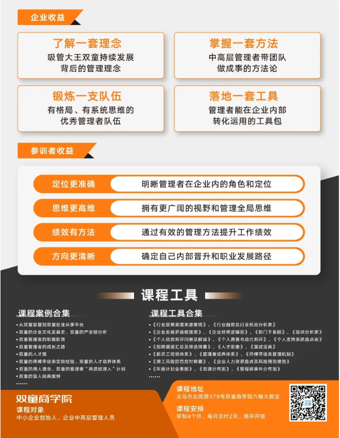 該課程學(xué)制為4個(gè)月,每月交付2天完成一個(gè)課程主題學(xué)習,循環(huán)開(kāi)班。為了不耽誤企業(yè)正常運轉,更好安排中層管理集中學(xué)習,開(kāi)課時(shí)間一般會(huì )安排在周六日。