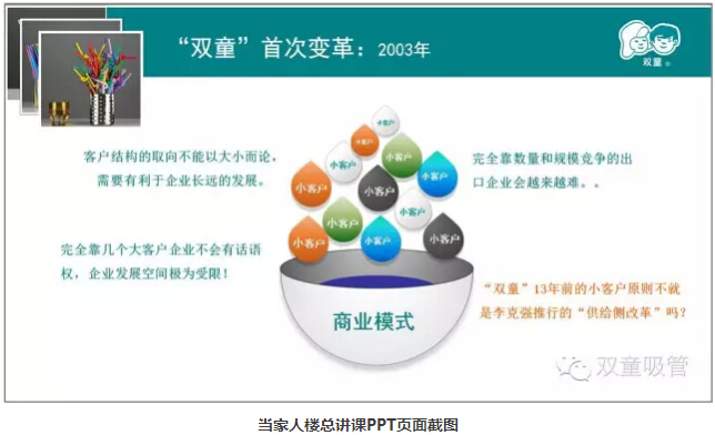 在義烏,小商品的門(mén)檻低,不起眼,吸管更是如此。但我們雙童吸管卻能把一種隨處可見(jiàn)的小商品在義烏市場(chǎng)上做到脫穎而出,到底是有什么力量在支撐呢?今天,吸管妞就向大家揭秘我們“雙童”的經(jīng)營(yíng)戰略,聊聊我們拒絕“大鱷魚(yú)”,專(zhuān)注“小蝦米”的“小客戶(hù)原則”!這個(gè)案例可是先后被收錄到清華、浙大等幾十所大學(xué)的MBA教材呢!
