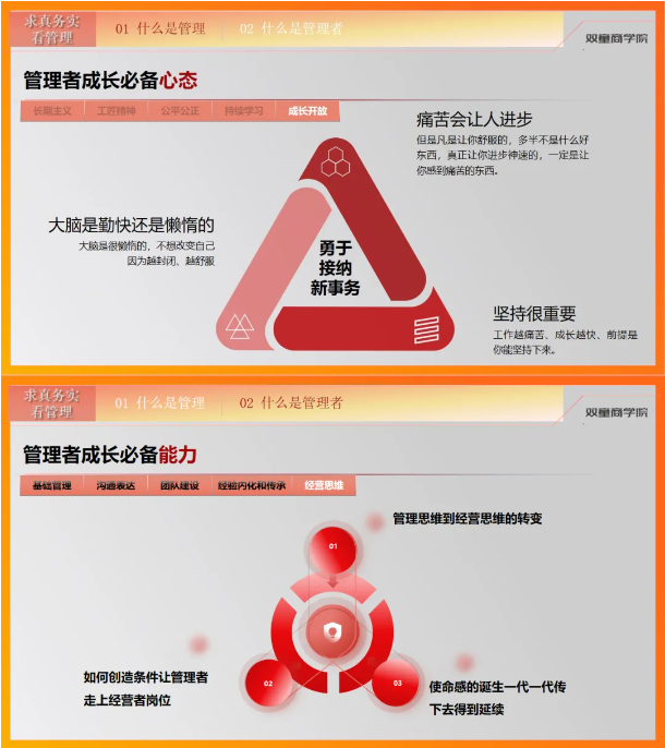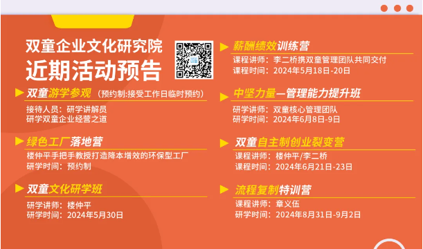 各位中小企業(yè)老板們,如果你也想把自己從大小瑣事中解放出來(lái),也想要一支有活力、強要性的管理團隊,該課程學(xué)制為4個(gè)月,每月交付2天完成一個(gè)課程主題學(xué)習,循環(huán)開(kāi)班。6月7日-8日,歡迎到雙童商學(xué)院參加學(xué)習!