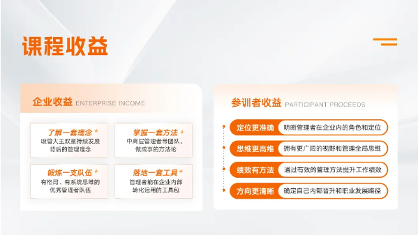 《中堅力量》全課程按照思維有高度、帶人有溫度、做事有力度、成長(cháng)有速度四個(gè)主題分期交付,秉著(zhù)實(shí)用主義的原則,各位老師在課程交付中,不僅拆解原理,還直接給工具、給方法,以幫助參訓企業(yè)全方位的提供管理者綜合素養!