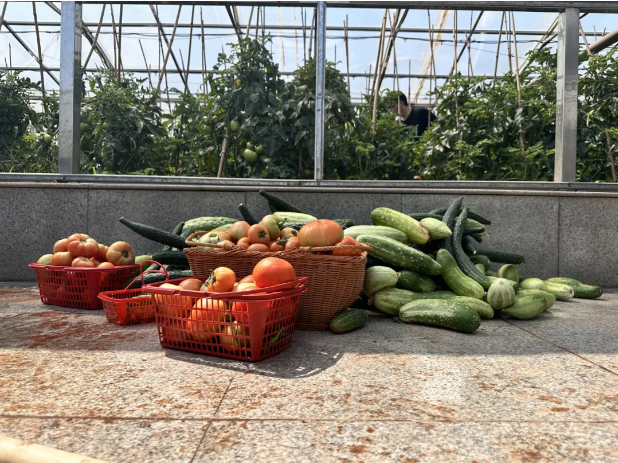 可能因為長(cháng)在屋頂,光照非常充足,又有園丁叔叔的細心照料,辣椒、黃瓜、豆角、西紅柿、青瓜,各種蔬菜爬滿(mǎn)了藤蔓,長(cháng)勢非常喜人!不一會(huì )兒的時(shí)間,大朋友、小朋友們都收獲頗豐!